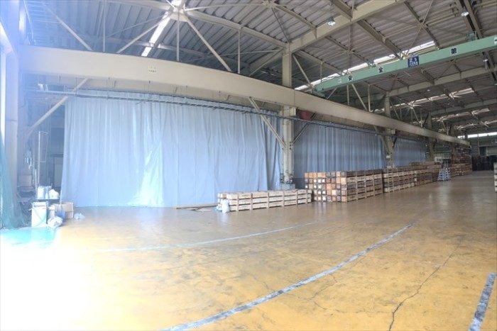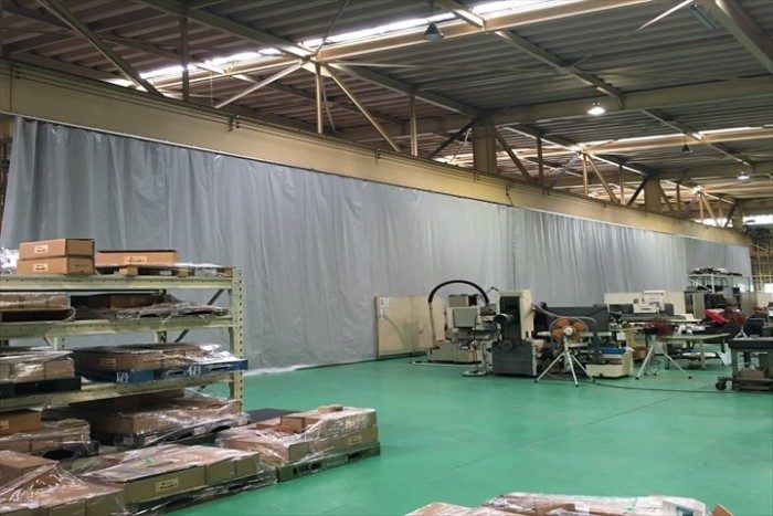 工場内にて大型の間仕切りビニールカーテンの設置工事を行わせて頂きました。高さは4メート以上で横幅は全部で30メートル程御座いました。上部のH鋼を利用しレールを設置したあとにカーテンを吊り下げた仕様となっております。使用したビニールシート材は防炎のウルトラマックスを使い耐久性にも優れているシート材をチョイス致しました。