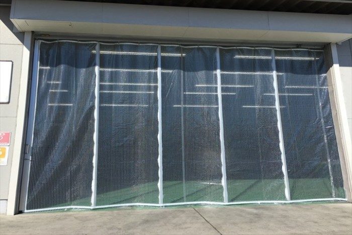 工場の屋外に面する場所でシャッターボックス直下に間仕切りビニールカーテンの設置工事を行いました。屋外に面している為、横風などであおられない様にアルミポールをシート材と一緒に吊り下げる仕様となっております。また、開閉時にはアルミポールも一緒に可動する為、十分な開口スペースを取れる仕様ともなっております。