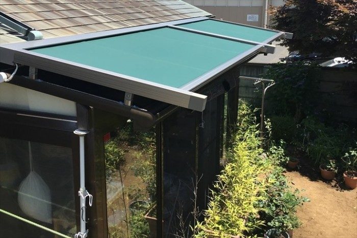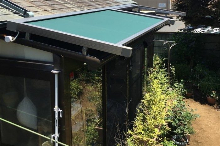 太陽の日差しから室内の温度が上昇するのを抑えたいと相談を頂き電動・可動式のソラシスを設置させて頂きました。本体はテンパル社製の電動型ソラシスを2基連結させてリモコンにて可動出来るタイプとなっております。設置後に室内へおじゃま致しましたが温度が全然違うと体感出来ました。
