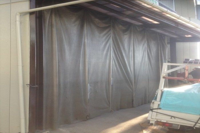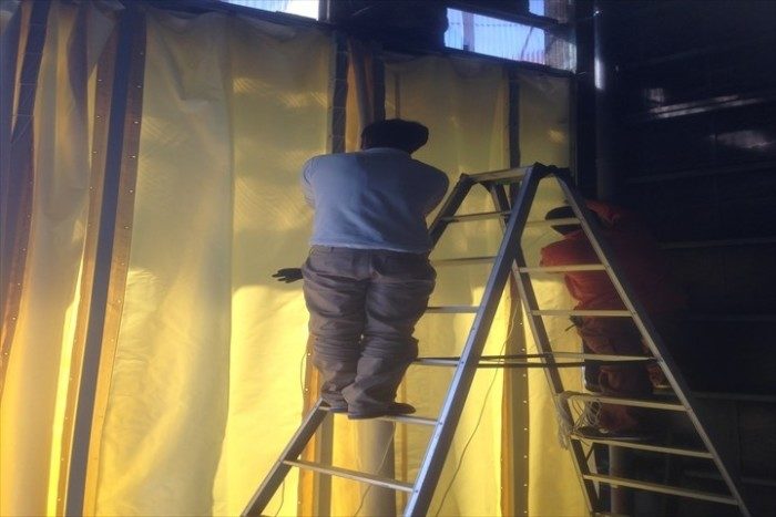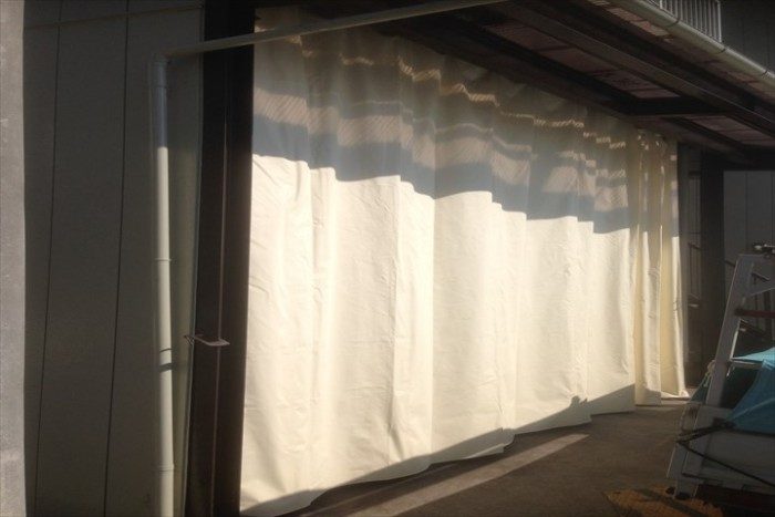 東京都内にて透明・糸入りカーテンから不燃ビニールカーテンへの交換工事を行いました。トラックレール・芯材カーテンの仕様にて耐久性もバッチリだと思います。屋外にて高さのある大型カーテンにはピッタリな仕様です。