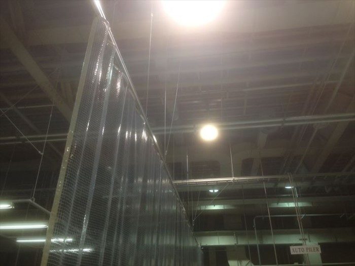 こちらは世田谷区の工場屋内の間仕切りカーテンですが、天井レールが使えなかったため、天井から2mほど下げた位置に業務用レールを取付、防炎・帯電防止のビニールカーテンを設置致しました。ビニールカーテンの重量とレール強度を考慮し、今回は糸入り透明ビニールで厚み0.3mm程度の素材を選定致しました。
