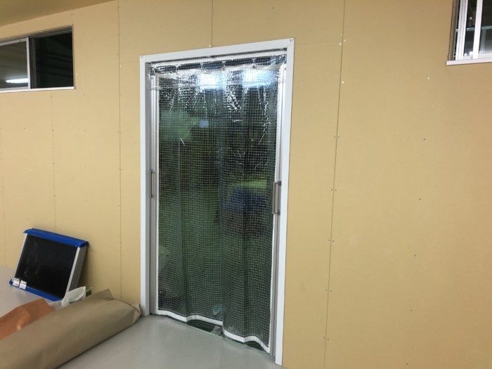 東京都のエリア内にて、工場内ビニールカーテンの設置工事をいたしました。今回、お客様のご要望により両サイドから出入りができるようにとご依頼をいただきましたので、両サイドには取手付ポールを使用しマグネットにて開閉可能となっております。尚、受け側は鉄板でマグネットがくっつきはしますが、磁力が弱いことを考慮し受け側にもマグネットを設置しております。作業自体はスムーズに完了したのもあり、作業員の方の妨げにもならず、とても満足のいく施工となりました。