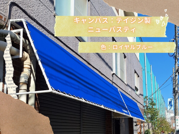 東京都内の某所にて軒先テントの工事を御依頼頂きました。軒先テントのフレームが2台並んでおり左右のサイズ違いで製作しキャンバスを張り込みました。キャンバスはテイジン製のニューパスティで色はロイヤルブルーをチョイス。カッティング文字はテント用に使用されるテンタックを切り文字で製作。きれいに仕上がった現場でした。
