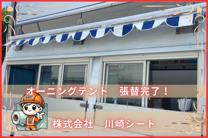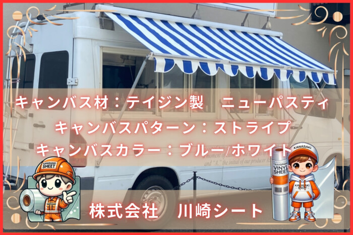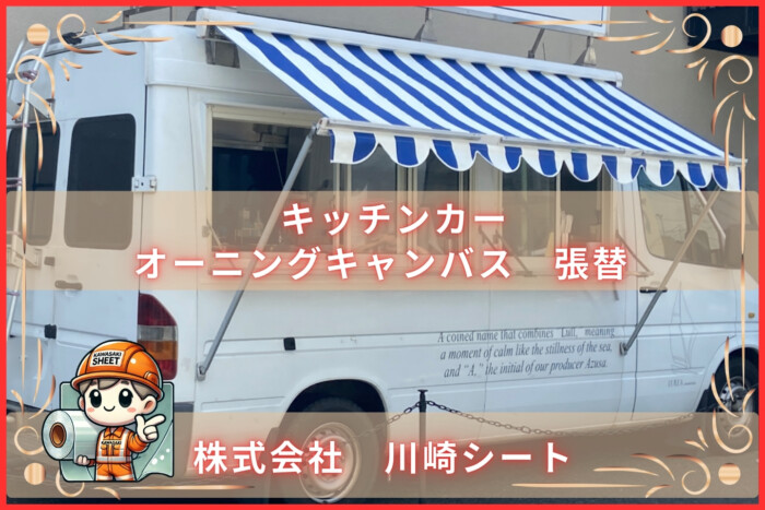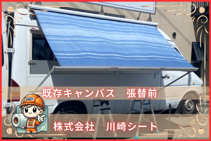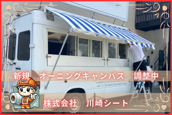 この度は神奈川県の某所にてキッチンカーに設置されているオーニングテントのキャンバス張替を行わせて頂きました。キッチンカーに設置されているオーニングキャンバスは特殊で構成されておりました。