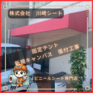 この度は東京都の某所にて店舗用の固定テント張替を行わせて頂きました。本体フレーム構造がアーチ形部分のあるテントフレーム構造になっている仕様です。新規キャンバスはテイジン製のテト・・・