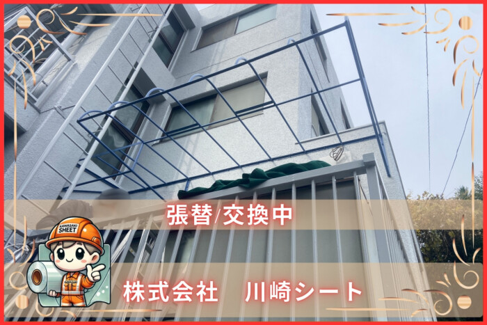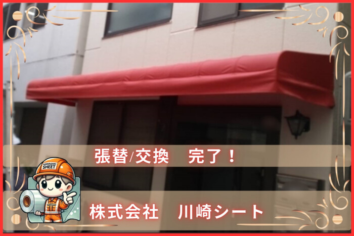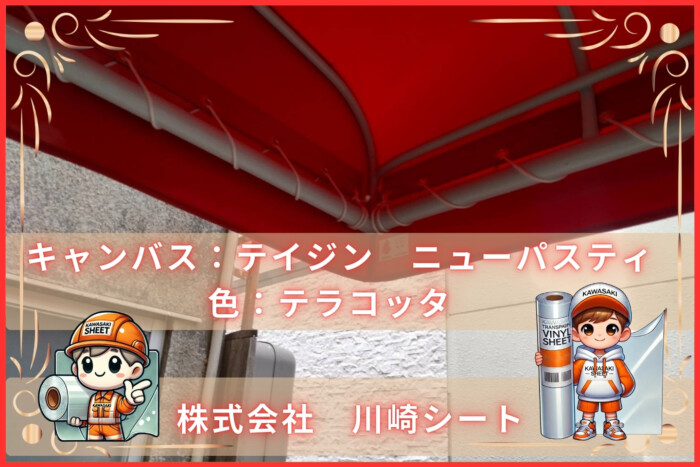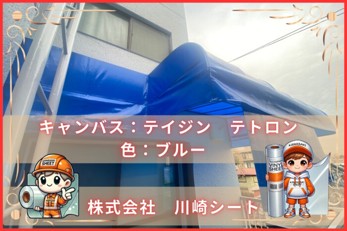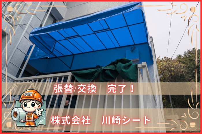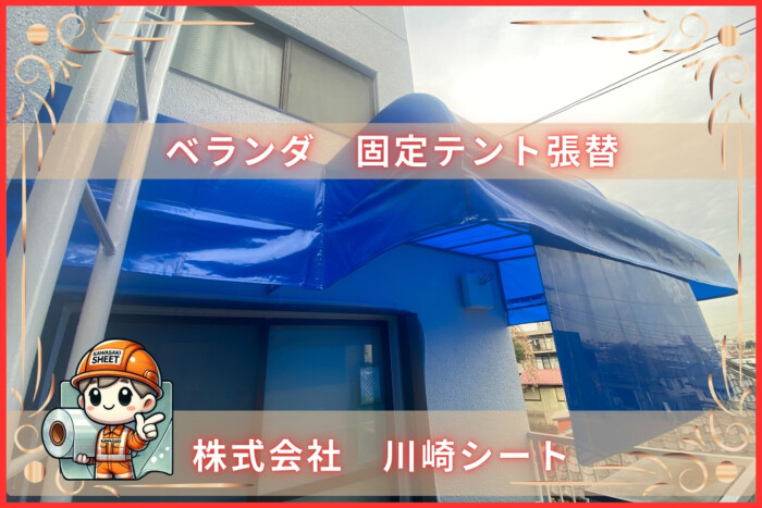 この度は東京都の某所にてベランダの固定テント張替を行わせて頂きました。変形したフレーム構造になっており切り欠きなどがあるフレーム構成です。新規キャンバスはテイジン製のテトロンを使用いたしました。