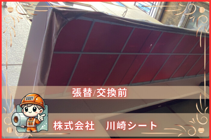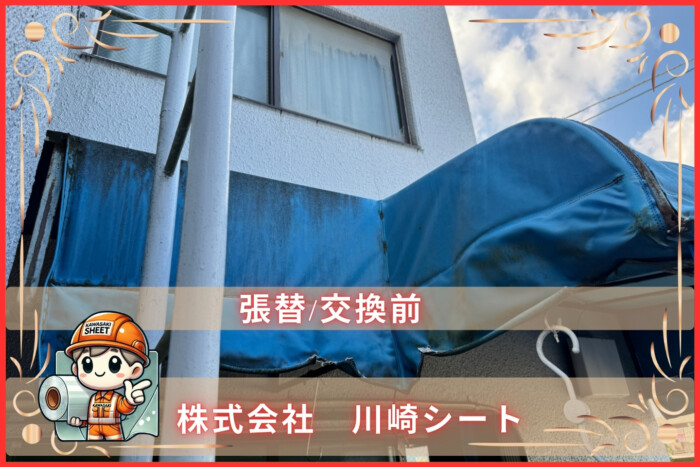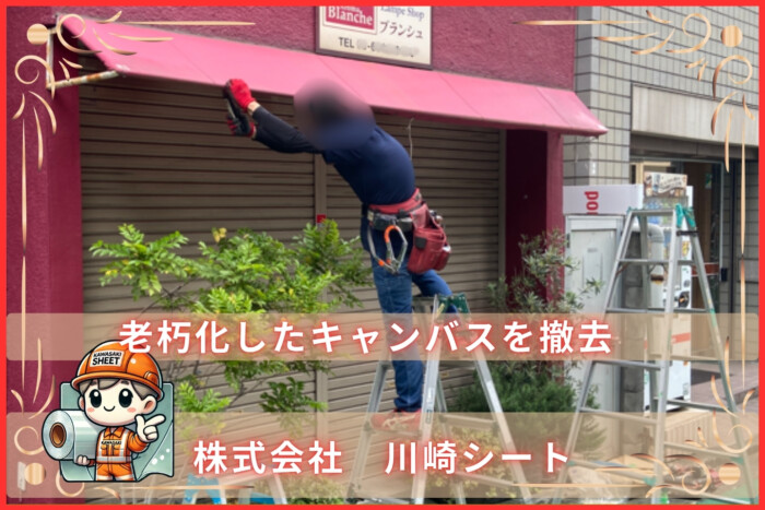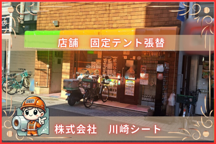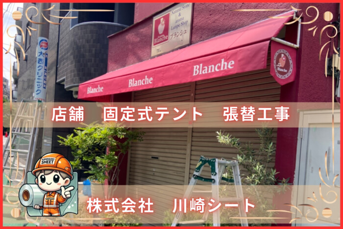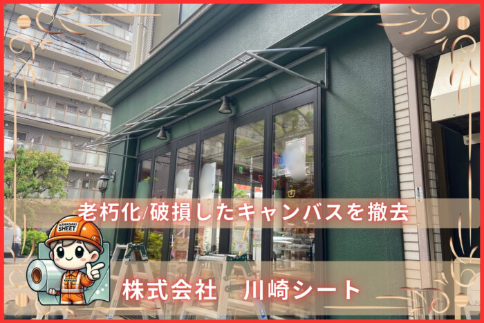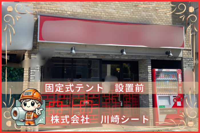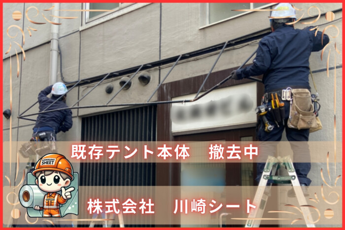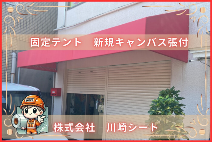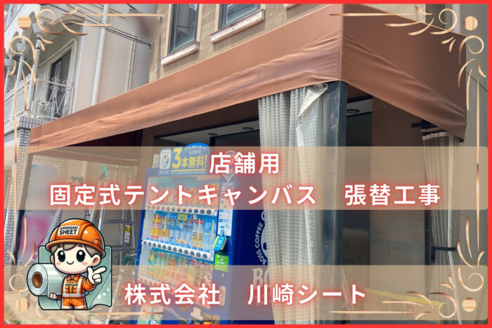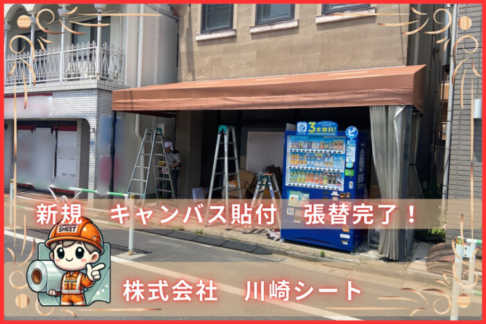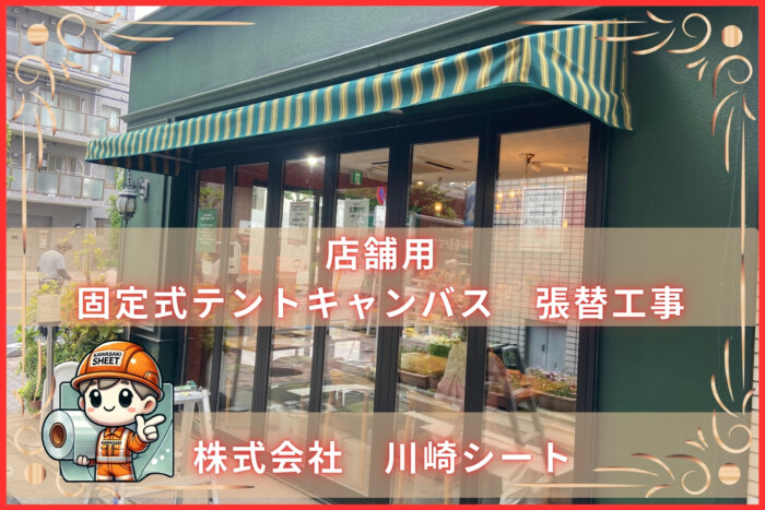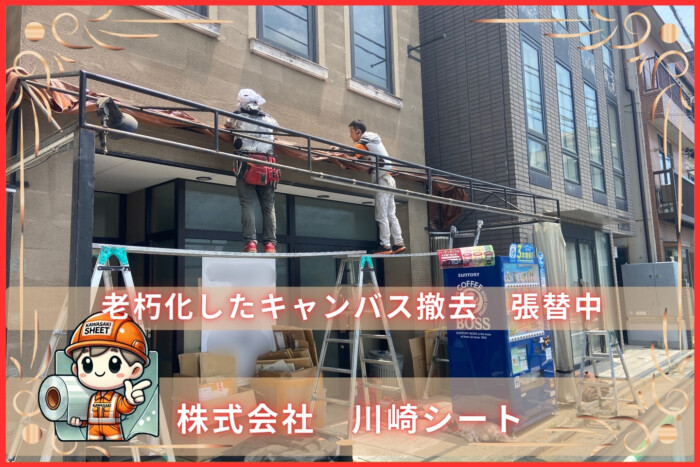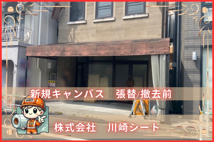 この度は固定テントキャンバスの老朽化により新規テントキャンバスの張替工事を御依頼いただきました。老朽化したキャンバスはコットン調のキャンバスでデザイン性に特化されておりますが長期使用で撥水性などが低下し汚れなどが付着し老朽化が進んでまいります。ですが今回はコットン調ではないため防汚効果も高く、またデザイン性も含め長期使用に向けても良いキャンバスを選択いたしました。