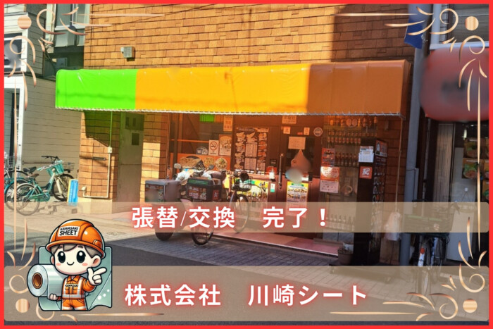 この度は店舗様からテントキャンバスの損傷による新規テントキャンバスの張替を御依頼いただきました。既存フレームの損傷は無くテントキャンバスのみ損傷でしたので大事には至っておらず新規テントキャンバスも綺麗におしゃれに仕上がり店舗様のイメージも良くなったと感じました。