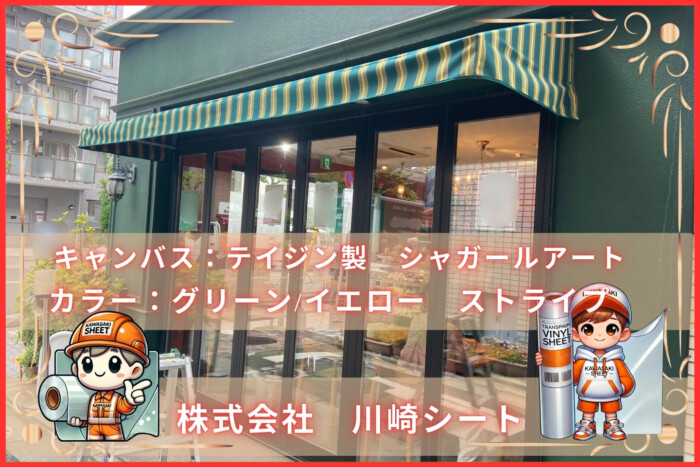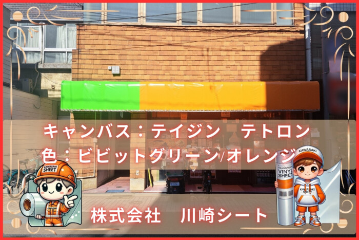 この度は東京都の某所にて店舗用の固定テント張替を行わせて頂きました。本体フレーム構造がアーチ形部分のあるテントフレーム構造になっている仕様です。新規キャンバスはテイジン製のテトロンを使用し2色のキャンバスカラーで仕上がっております。