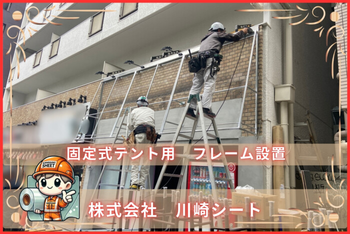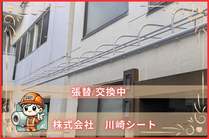 この度は東京都の某所にて軒先テントの張替を行わせて頂きました。本体フレームは湾曲するアーチ部がある構造体です。湾曲したアーチ部があるテントは計測などで型取りなどが必要になるケースがございます。