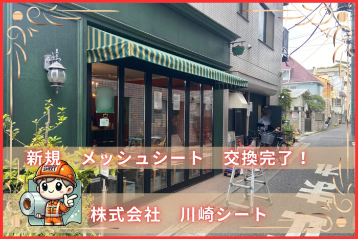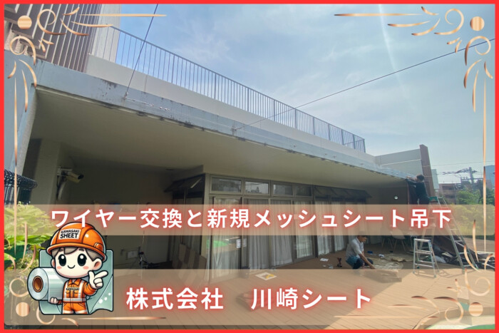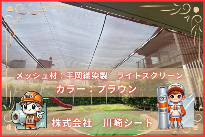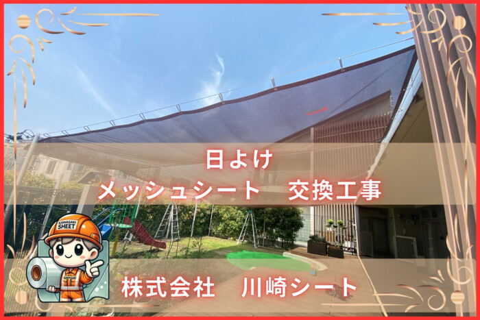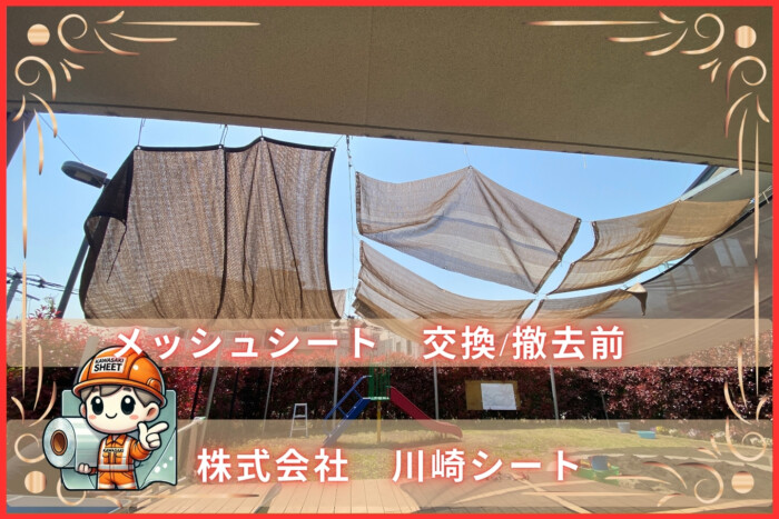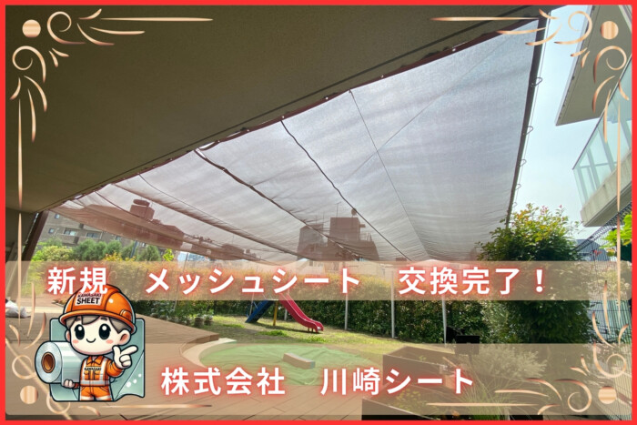 今回は子供さんたちが遊ぶ場所の日よけ用メッシュシートの交換工事を行わせていただきました。夏の強い日差しから子供さんの熱中症などを防ぐ重要な製品と思いますね。