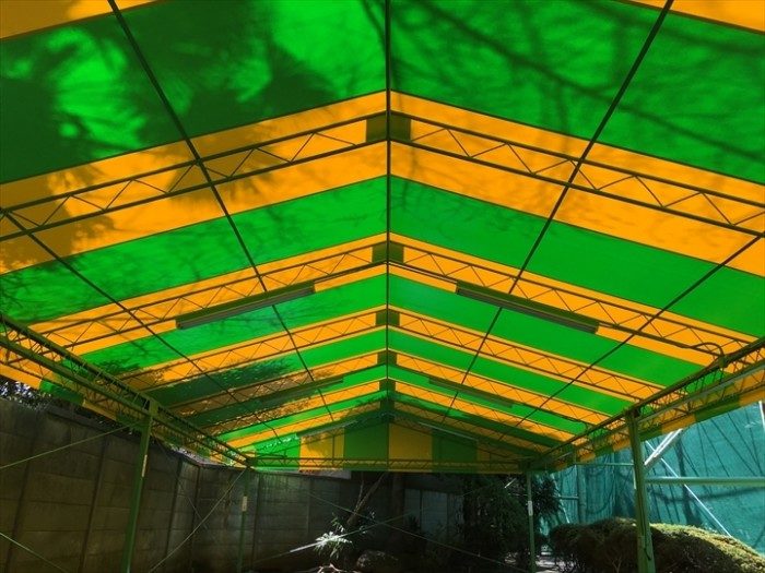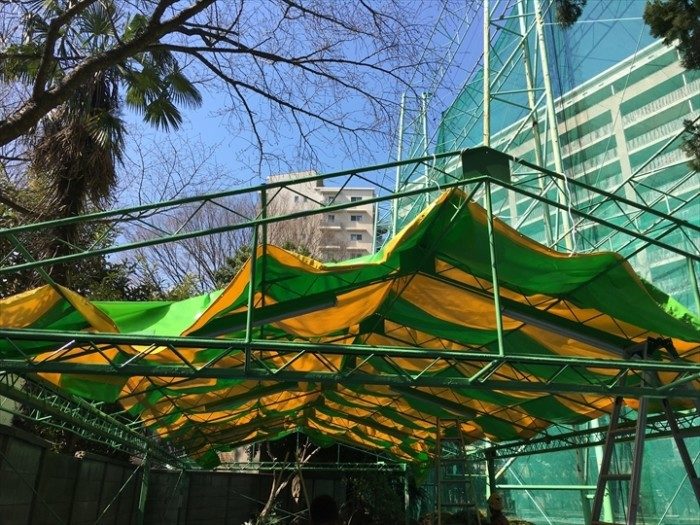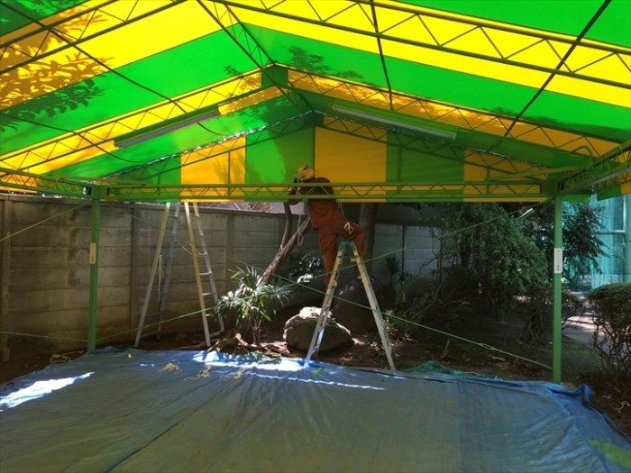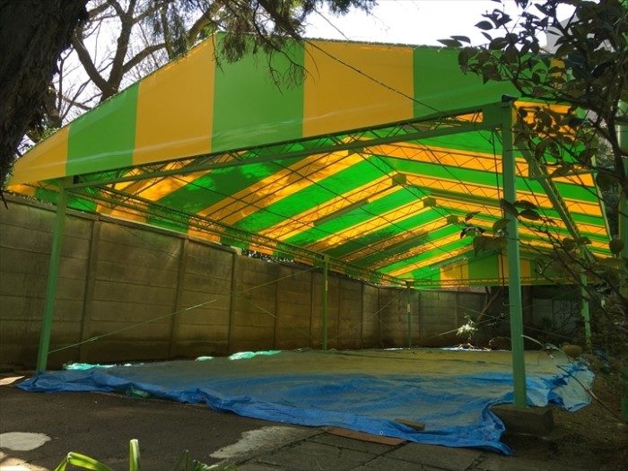 豊島区にてゴルフ場の施設内のパター練習場所のテントの張替を行いました。シートは防炎・耐久性に優れているウルトラマックスを使用致しました。2色のシートを使用しストライプ仕様にて作製し張替工事を無事に行うができて張替後の見栄えもバッチリに仕上がりました。