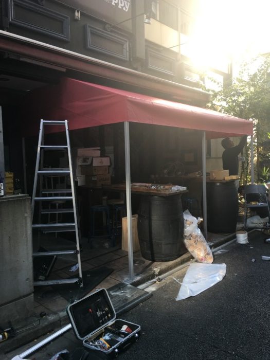 東京都内にて店舗用の軒先テントの張替工事を行いました。使用したキャンバスはテイジン製のニューパスティで軒先やオーニングの張替キャンバスに人気の材質です。近日に新規オープンとの事で張替工事も間に合い喜んで頂けました。